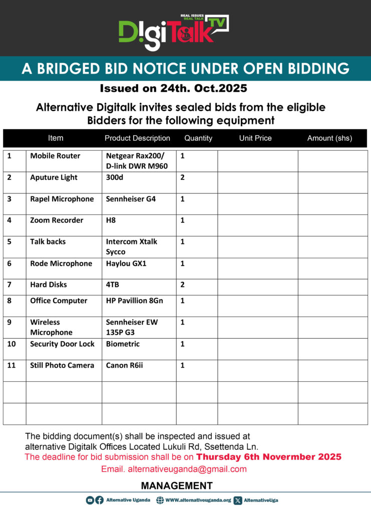 The Alternative Uganda born by The Jobless brotherhood in June 2014, We're a non-partisan/non-violent Social Movement whose aim is to see a youth led change. Creating Tomorrow Today: This-Is-Us . We're based in Kampala Uganda, East Africa an established NOT-FOR PROFIT online Media Platform under Alternative Digitalk, also known as Digitalk TV. We offer space to the barred, unheard, marginalized and vulnerable voices . Digitalk Tv; Real Issues, Real Talk.